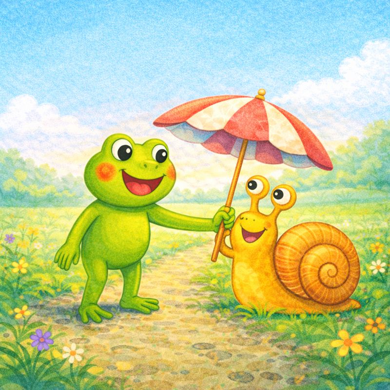 En su camino, saltando entre charcos y canciones, conoce a Crispino, un simpático caracol con sombrilla y una gran sonrisa.